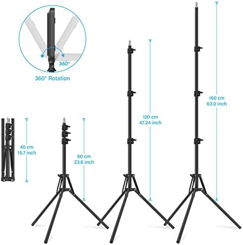 Variable Height: Collapsible Tripod Base and adjust the height from 23.6″ (60cm) to 63″(160cm) by loosening and tightening the knob attached to the main stand. It folds down to 15.7″/40cm for storage and transport