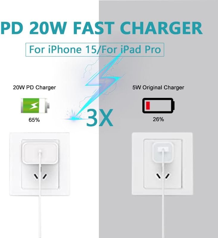 【Compatible with iPhone 15 Fast Charger 】 USB C Wall charger provides 20W power output and charges your phone up to 50% more in just 30 minutes, which is 3 times faster than the original charger and saves you more than 1 hour.