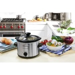 The Elite Gourmet 1.5 qt. Mini slow cooker is perfect for cooking and serving small one-pot meals and appetizers such as soups, stews, meatballs, dips, and sauces. It’s a great kickoff for a fondue party or where everyone prepares their favorite dip in their 1.5 qt. Mini slow cooker. This versatile small appliance can be a single person’s best companion as well as the All-Star at your next super bowl party. It features low and high temperature settings, A keep-warm setting allowing you to keep your meal hot and fresh before It’s served, and an attractive Stainless Steel finish. It includes a removable inner stoneware pot that’s easy to clean, with a tempered glass lid with metal rim for easy viewing of cooking cycle and cool-touch handles and knob for safe handling.